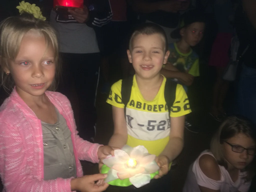 Единственное, что не учли организаторы — полное отсутствие течения на пруду. Отправленные в плавание фонарики так и остались возле берега.