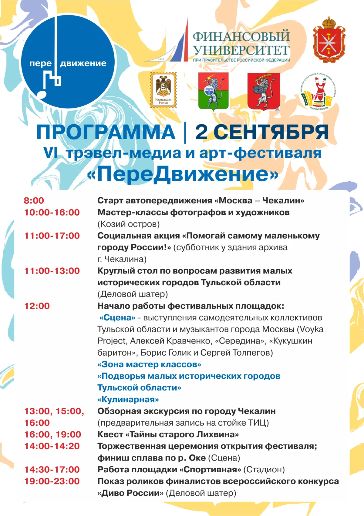 Гостей фестиваля ждет концертная программа, а так же экскурсии, автоопробег по малым историческим городам Тульской и Калужской областей, сплав по Оке, пленэр художников, мастер-класс фотографов, квест «Тайны Лихвина» (историческое название города Чекалин).