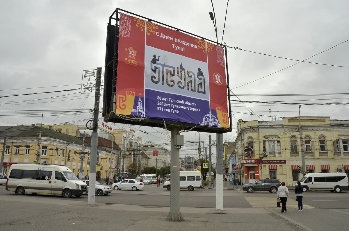 В Туле установили праздничные рекламные конструкции, флаги и баннера.