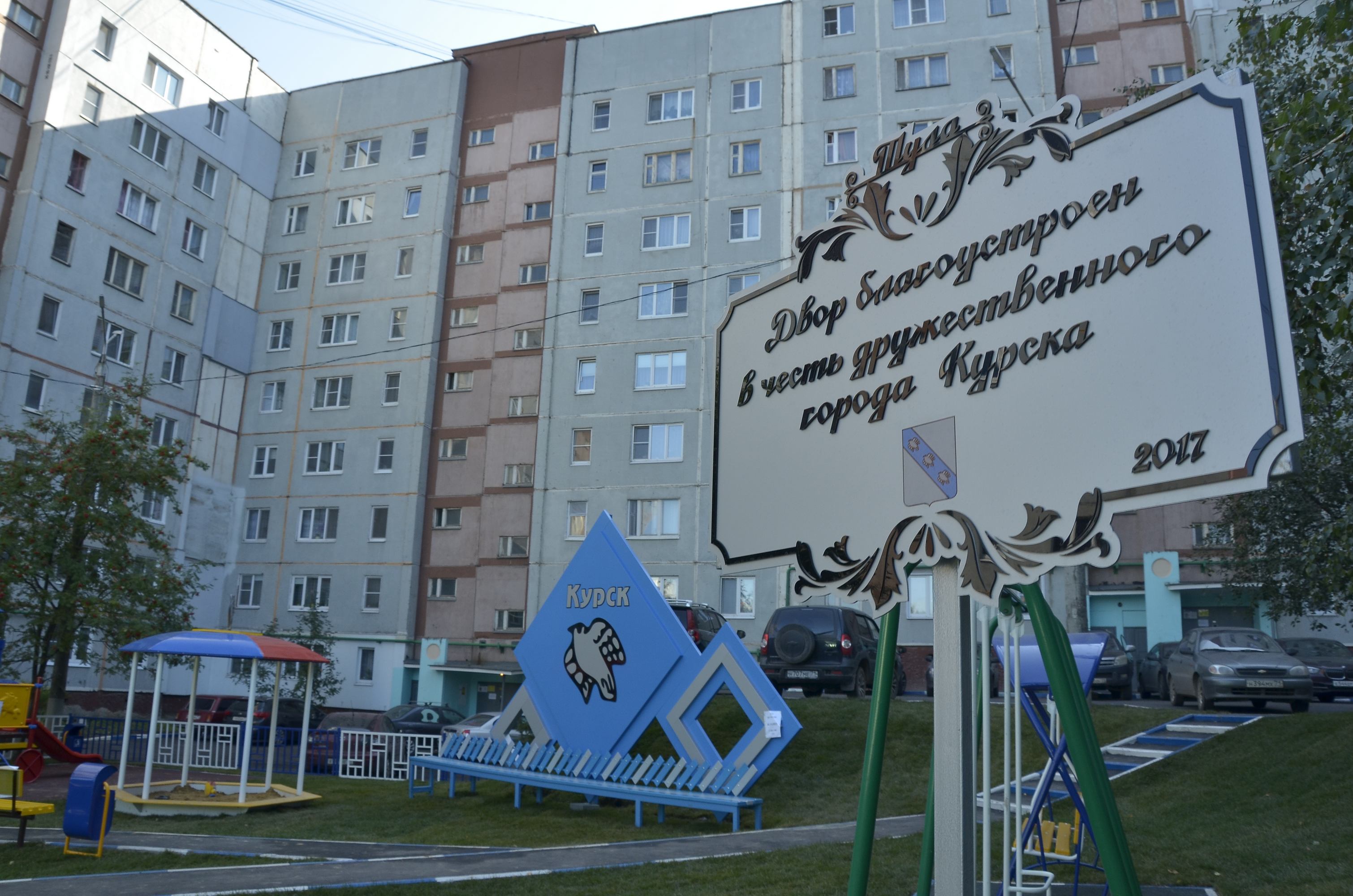 В Зареченском округе на ул. Галкина, 10 выполнено благоустройство тематического двора в честь Курска. Также здесь установлена большая скамейка, украшенная символикой Курска.