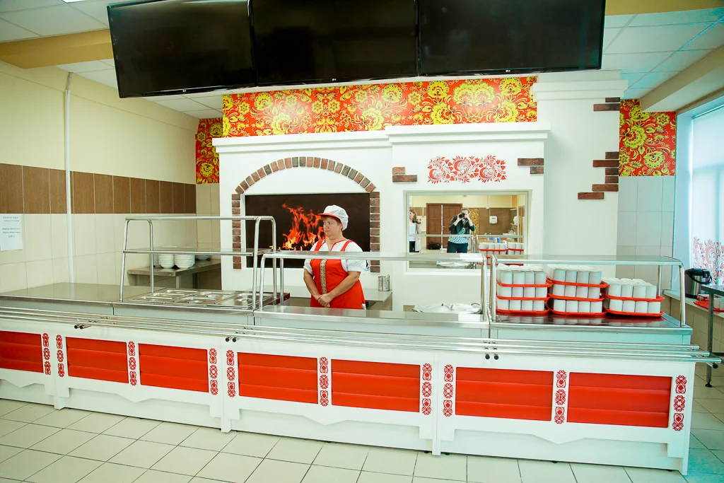 За лето столовую и пищеблока капитально отремонтировали, закупили новое современное оборудование и инвентарь. Столовая оформлена в стиле русской избы. Здесь «трапезничают» 898 учеников.