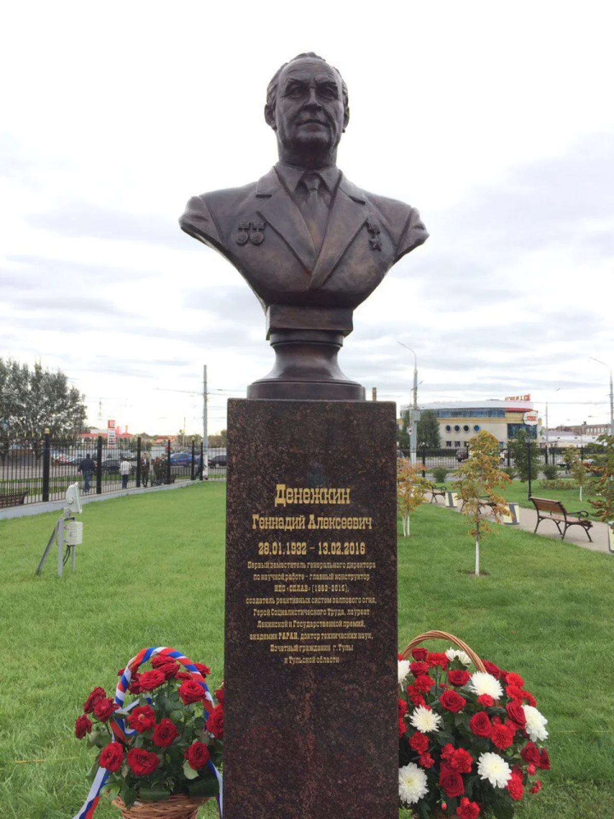 Сегодня на Аллее славы перед Тульским музеем оружия установили памятный бюст Г.А. Денежкину – легендарному учёному и конструктору, разработчику реактивных систем залпового огня, Герою Социалистического Труда, лауреату Ленинской премии и Государственной премии РФ, заслуженному конструктору РФ.