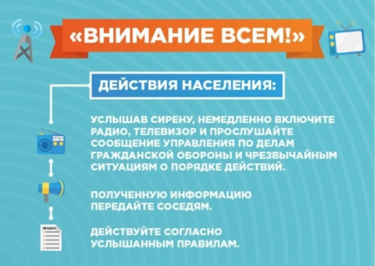 При этом необходимо включить телевизор, радиоприемник, репродуктор радиотрансляционной сети и прослушать сообщение о нижеперечисленных сигналах или информацию о действии в ЧС.