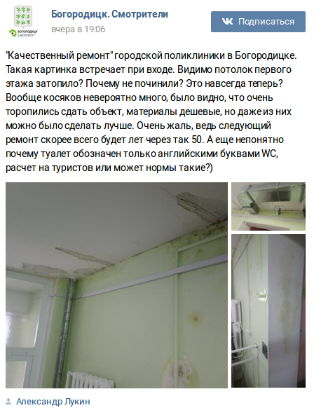 Жители Богородицка негодуют. Свежий ремонт местной поликлиники оставляет желать лучшего. Штукатурка местами отвалилась, на стенах и потолке разводы от протекающей крыши, кабель-каналы вкривь и вкось… В общем, красота страшная.