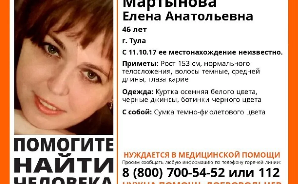 С 11 октября от женщины нет никаких вестей. Волонтеры поискового отряда «Лиза Алерт» просят туляков помочь отыскать 44-летнюю Елену Мартынову.