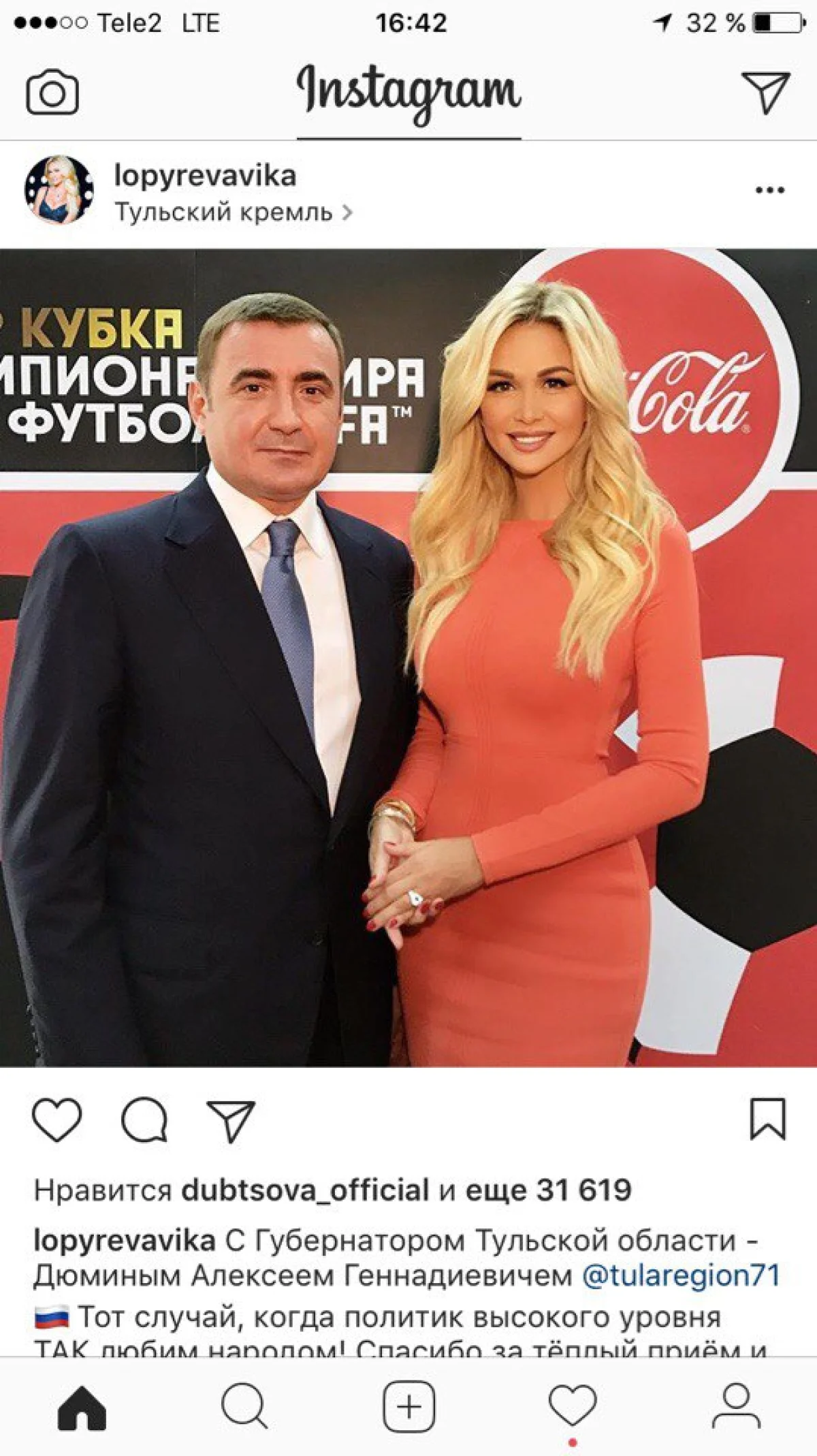 Позже девушка выложила в своём инстаграме фото с губернатором Тульской области Алексеем Дюминым.