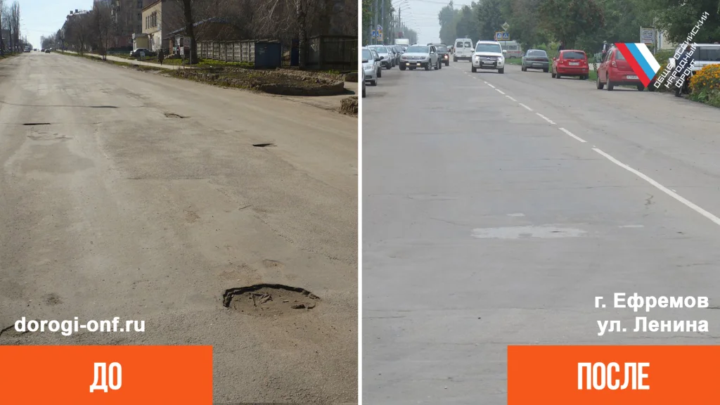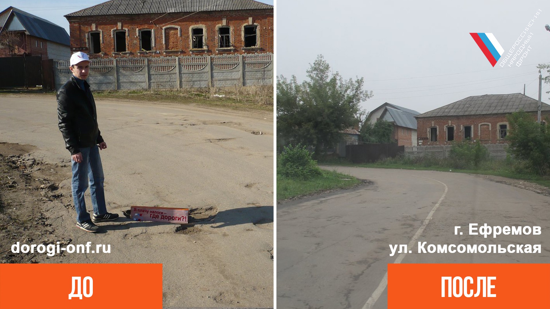 Активисты регионального отделения Общероссийского народного фронта в Тульской области в рамках проекта «Дорожная инспекция ОНФ/Карта убитых дорог» добились ремонта 13 дорожных участков в городе Ефремов. Ямочный ремонт был проведен на участках улиц Ленина, Дачной, Комсомольской, Ломоносова, Менделеева, Октябрьской, Строителей, Свердлова, Московской заставе и на Тульском шоссе.