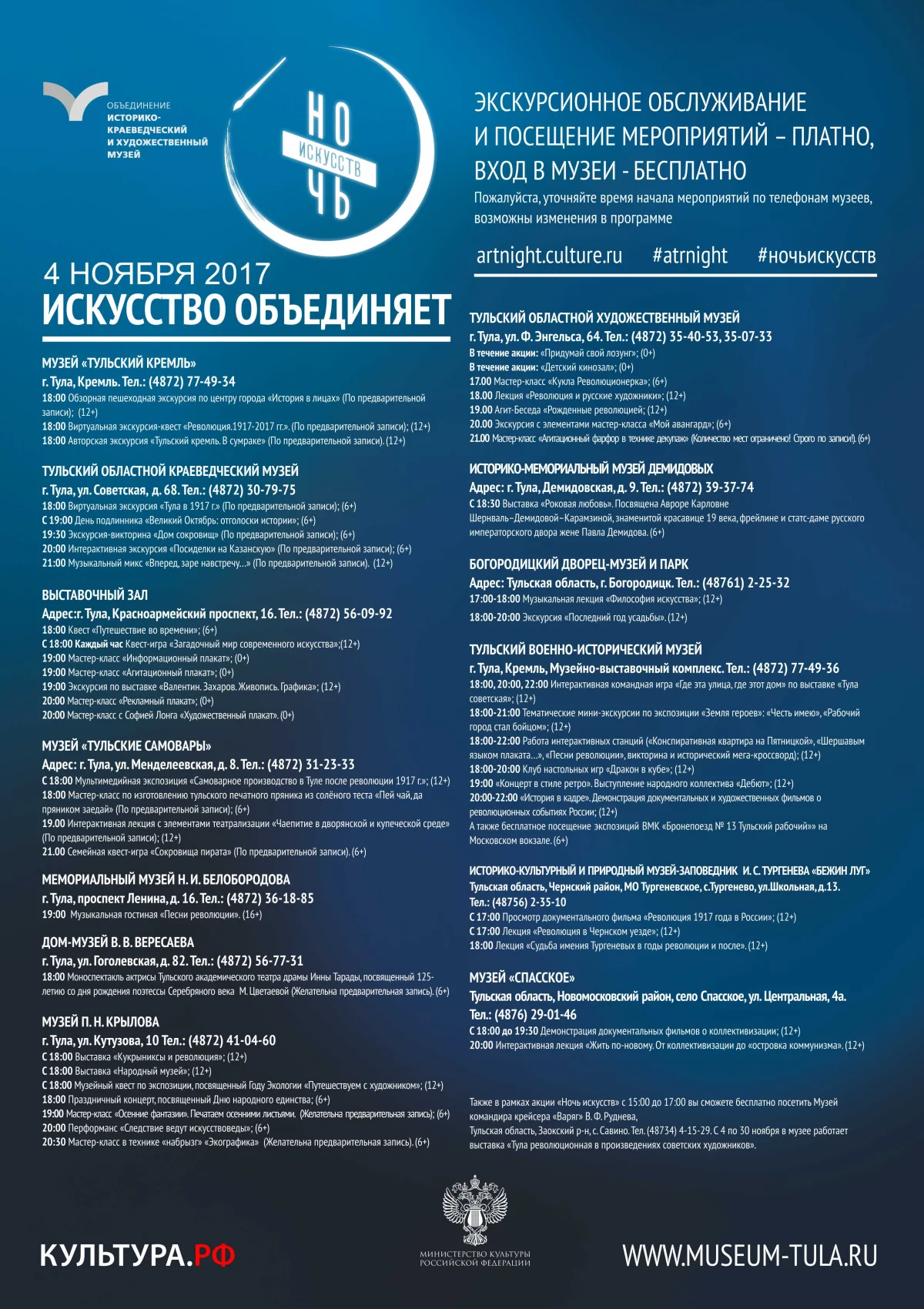 В этом году 4 ноября акция пройдет под девизом «Искусство объединяет»! Туляков ожидают тематические экскурсии, моноспектакль, концерты, мастер-классы, квест-игры, просмотр документальных фильмов и многое другое! Мероприятия будут посвящены в том числе 100-летию революции 1917 г.