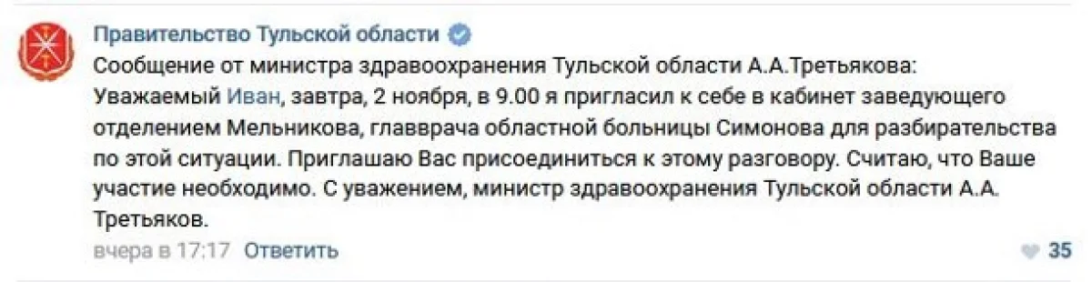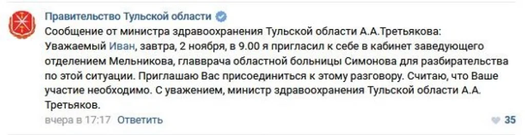 Министр здравоохранения Тульской области отреагировал на видеоролик. В соцсети появился комментарий от его лица: