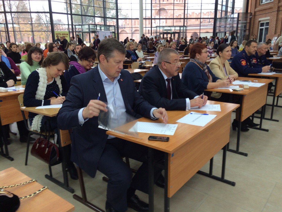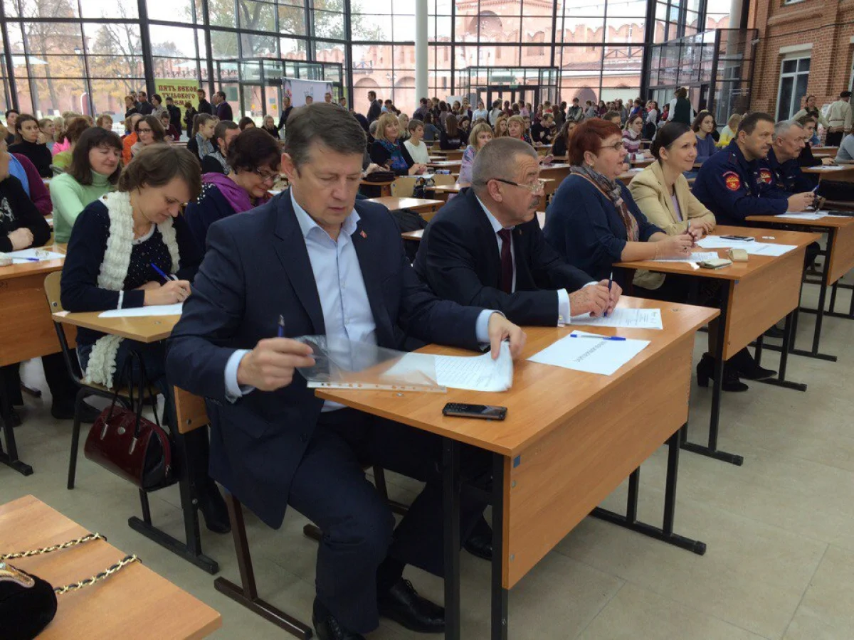 В Туле к диктанту присоединились председатель правительства Юрий Андрианов и глава администрации Евгений Авилов. В кремлевком атриуме они выбрали места для «отличников» - первую парту.