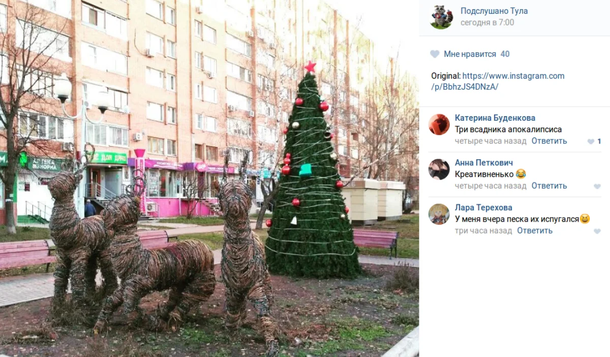 В преддверии Нового года на пересечении ул. Лейтейзена и Красноармейского проспекта установили скульптуру из трех оленей, которую находчивые туляки уже прозвали «Три всадника апокалипсиса».