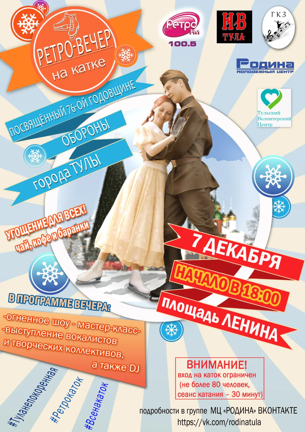 Тулякам и гостям города предлагают вспомнить душевную атмосферу, которая царила на катках в довоенное и послевоенное время. Будет играть музыка в стиле ретро, в программе вечера - огненное шоу, конкурсы и состязания, мастер-класс от ледовой студии.