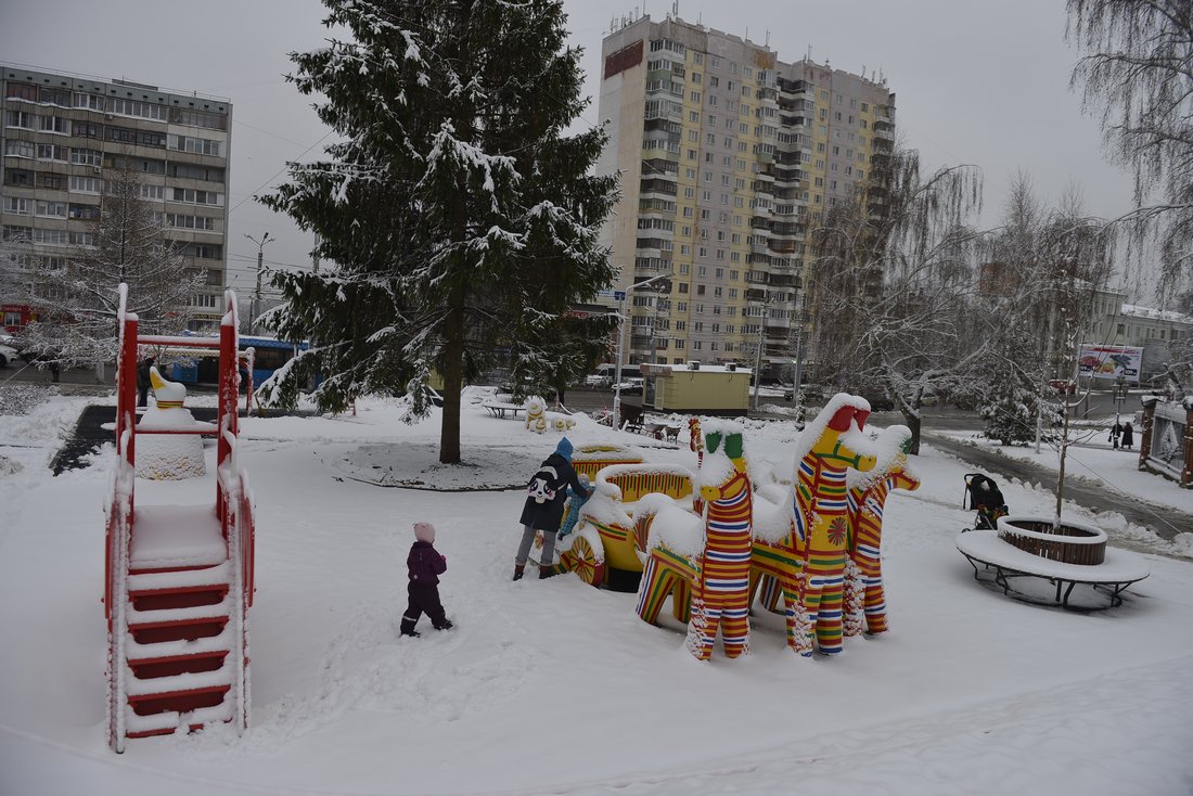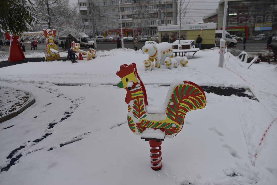 Фигуры выполнены из полимерных материалов. Также в сквере установлены горка и качели из влагостойкой фанеры, уложено резиновое покрытие. В центре детской площадки посажена живая ель. Отойти от традиционной голубой глины пришлось для того, чтобы изделия служили долго, не портились от дождей и морозов.