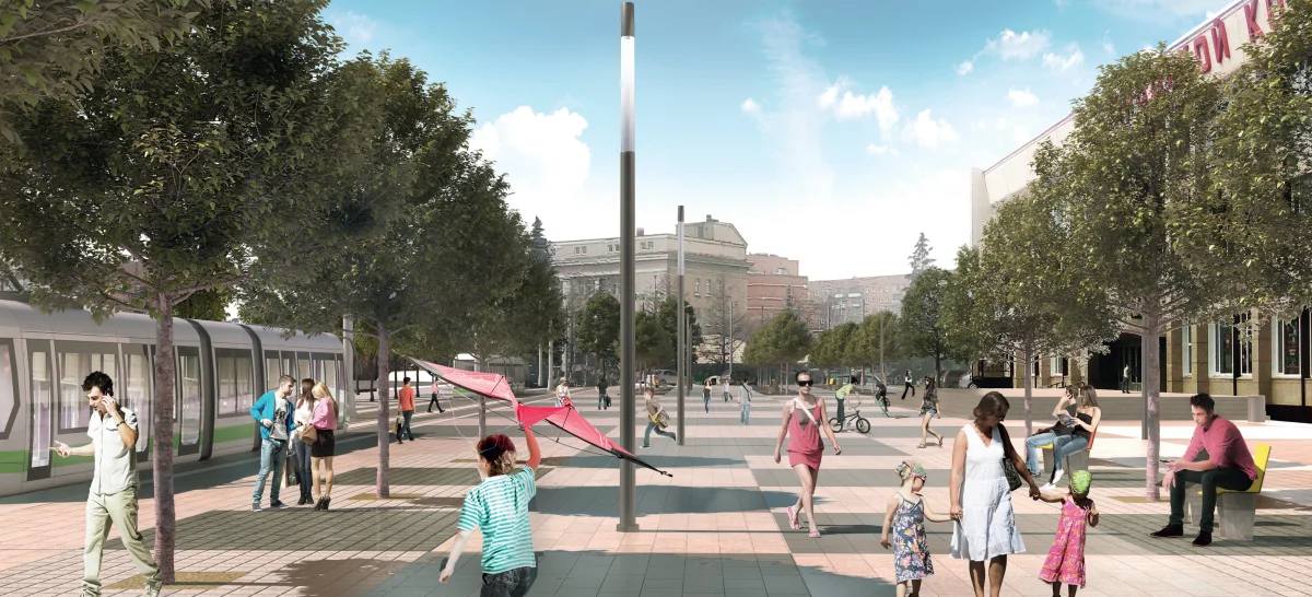 Возле Городского концертного зала по предложенным проектам предлагается замена покрытия площади, а также высадка деревьев, которые разграничат пространство, при этом планируется и замена остановочных навесов. Данные меры позволят сделать акцент на пешеходной зоне.