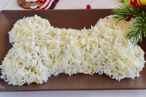 На блюдо для подачи праздничного салата первым слоем выложить картофель, формируя из него ушки и мордочку собачки.
