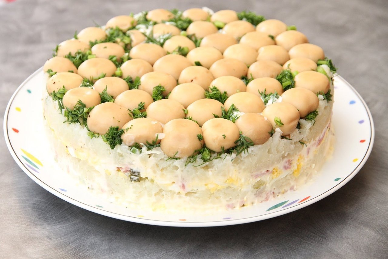 быстро, возможно, стоит немного подождать, и салат сам выскользнет из формы. Салат «Грибная Поляна»