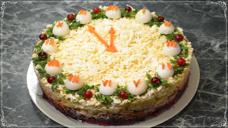 10. Украсить новогодний салат зеленью и клюквой, половинками перепелиных яиц в виде циферблата часов и морковными