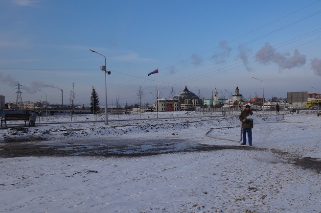 Ледовая площадка обустроена вдоль железнодорожных путей. Работает прокат коньков.