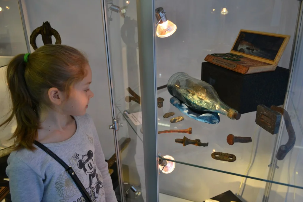 Помимо отлично оформленных копий художественных полотен, гравюр, акварелей, медалей из музейных фондов на выставке представлены подлинные предметы и подводные находки, обнаруженные тульскими дайверами на местах крушений кораблей XVIII – XIX вв. Юных посетителей, без сомнения, заинтересуют «интерактивные» экспонаты: настоящий корабельный колокол, действующий штурвал и судовой компас, макет старинной пушки и другие морские раритеты. При этом все можно трогать и крутить!