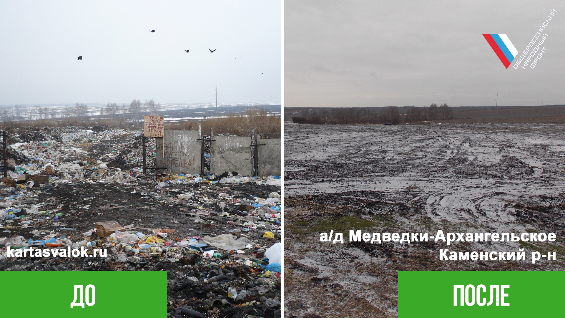 Говоря о наиболее ярких результатах, активисты ОНФ отмечают свалку, расположенную в Каменском районе вдоль автодороги Медведки – Архангельское. В начале 2017 г. местные жители сообщили, что на закрытый полигон свозится мусор, который разлетается по окрестностям. Как стало известно, полигон площадью около 1 га действительно был закрыт еще в 2014 г.