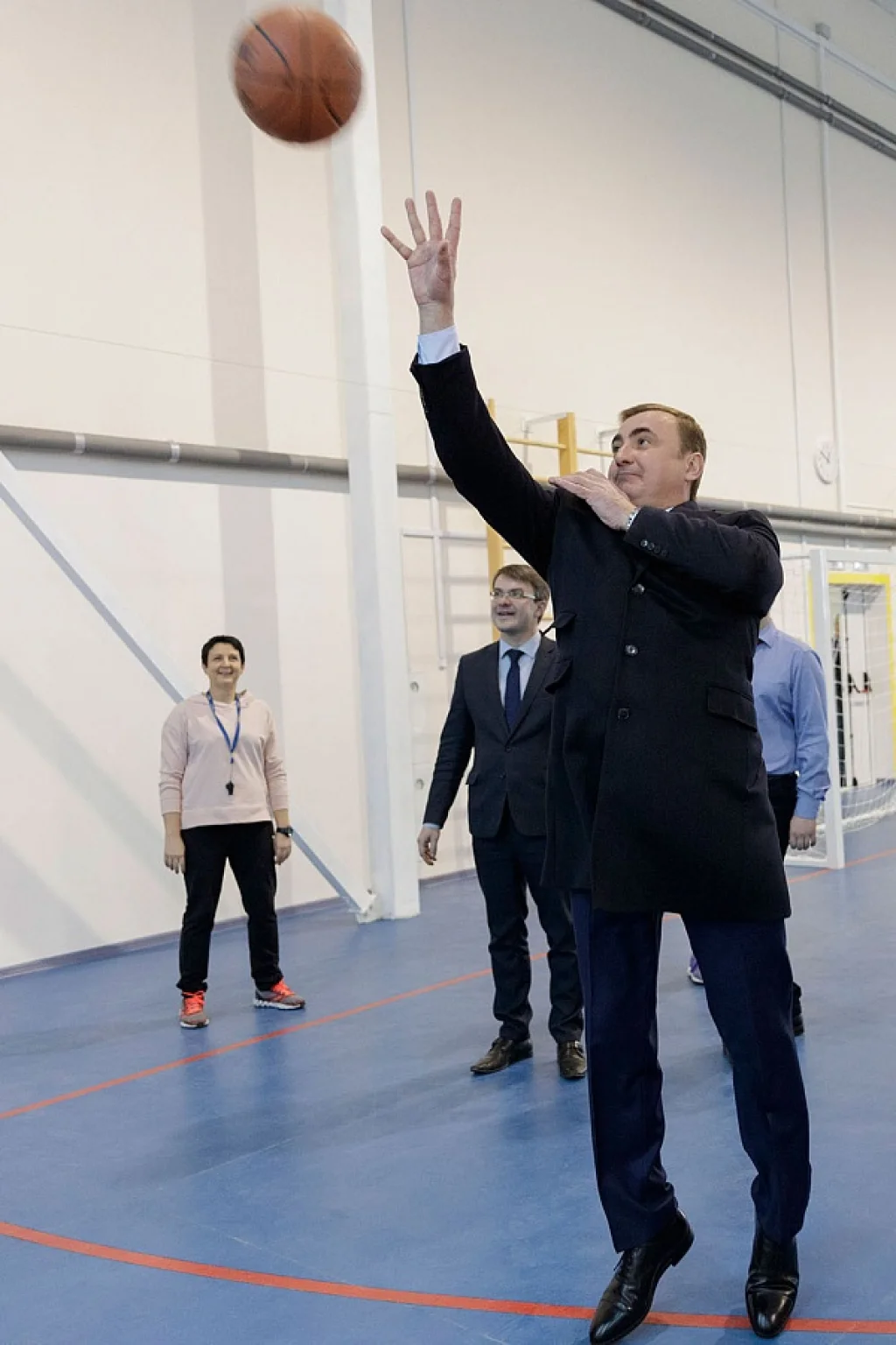 Губернатор осмотрел спортивный зал на 1-м этаже и даже забросил в корзину баскетбольный мяч.