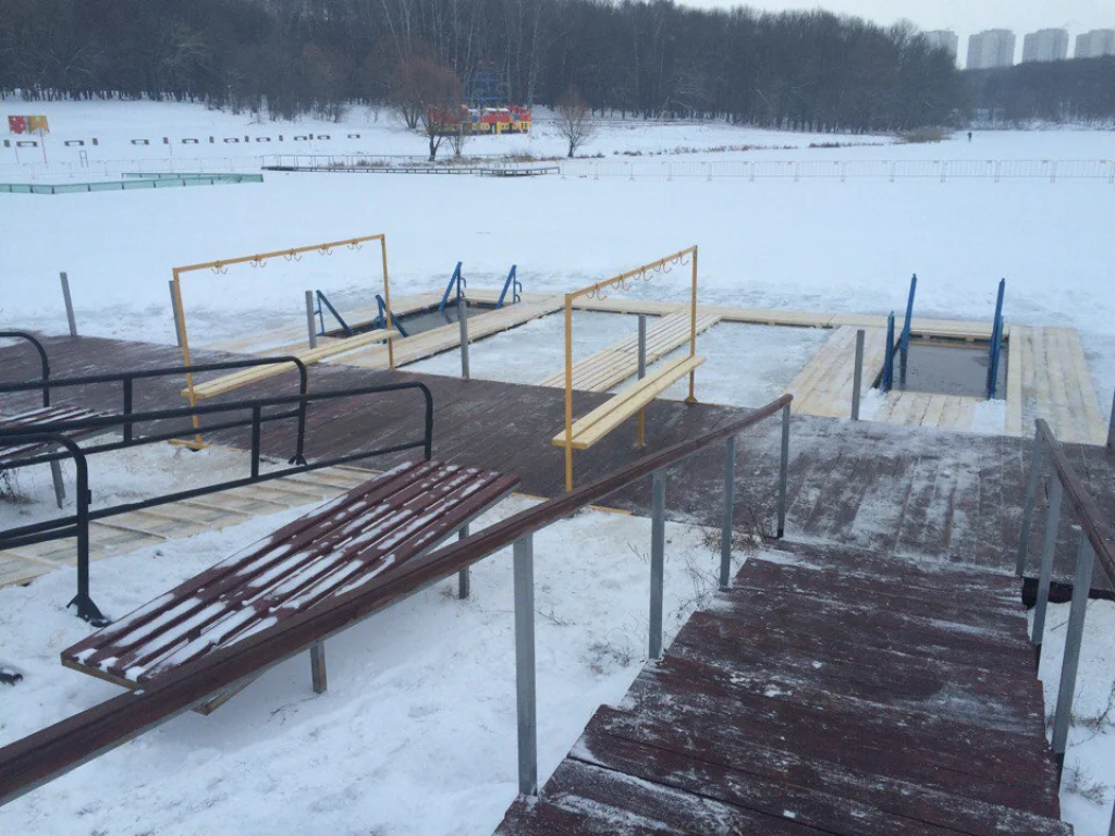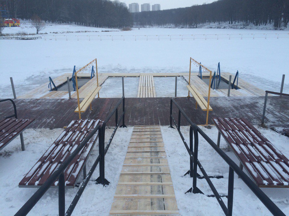 Уже утром на среднем пруду парка установили оборудование для купания, поставили специальные поручни.
