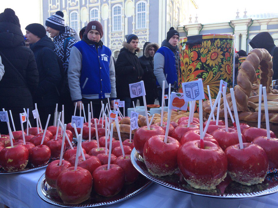 Изюминка праздника — гигантский пирог с фруктовыми начинками размером чуть ли не с кремлёвскую стену. Также участников мероприятия кормят карамельными яблочками и поят горячим чаем из самоваров.