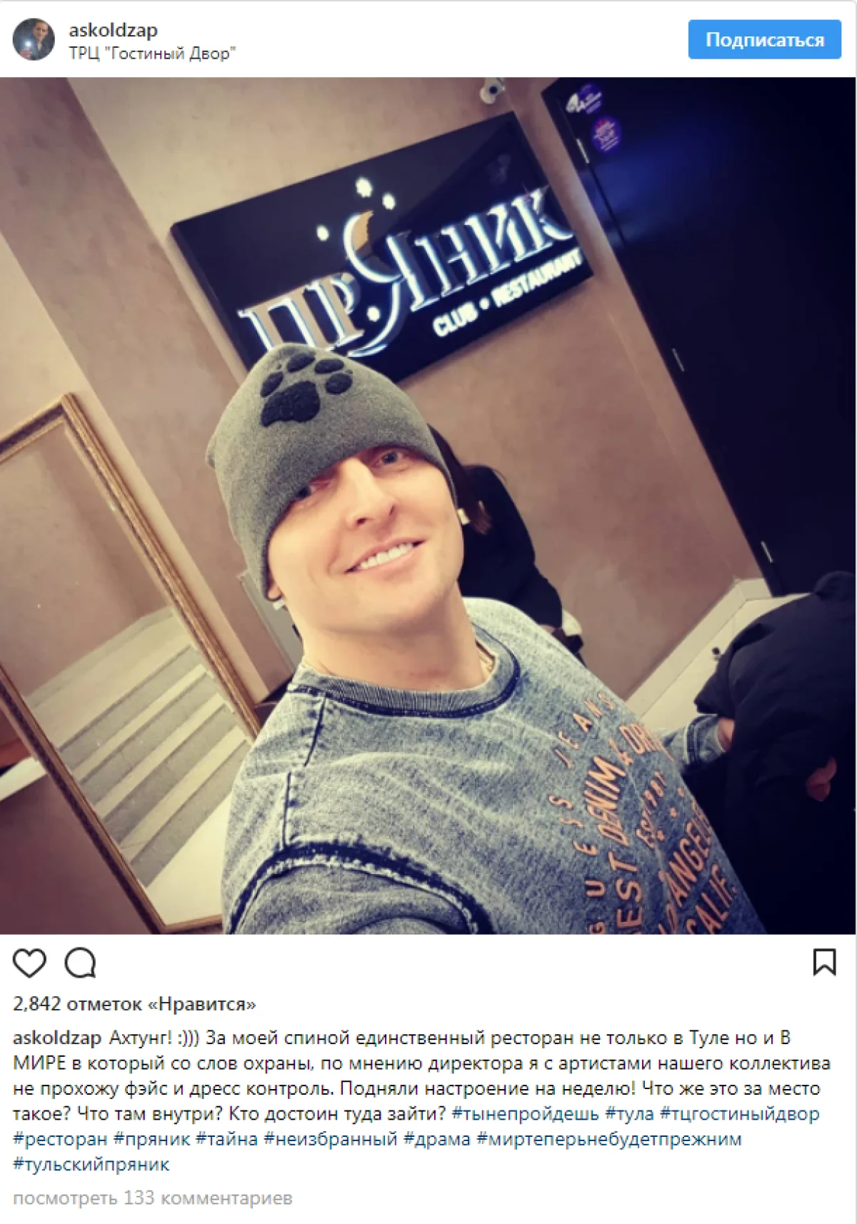 Известного дрессировщика Аскольда Запашного не пустили в тульский ресторан «Пряник». Охрана и директор заведения выставили артиста и его коллектив, пояснив, что они не проходят по фэйс-контролю и дресс-коду. «Подняли настроение на неделю! » , - написал Аскольд в своем инстаграме.