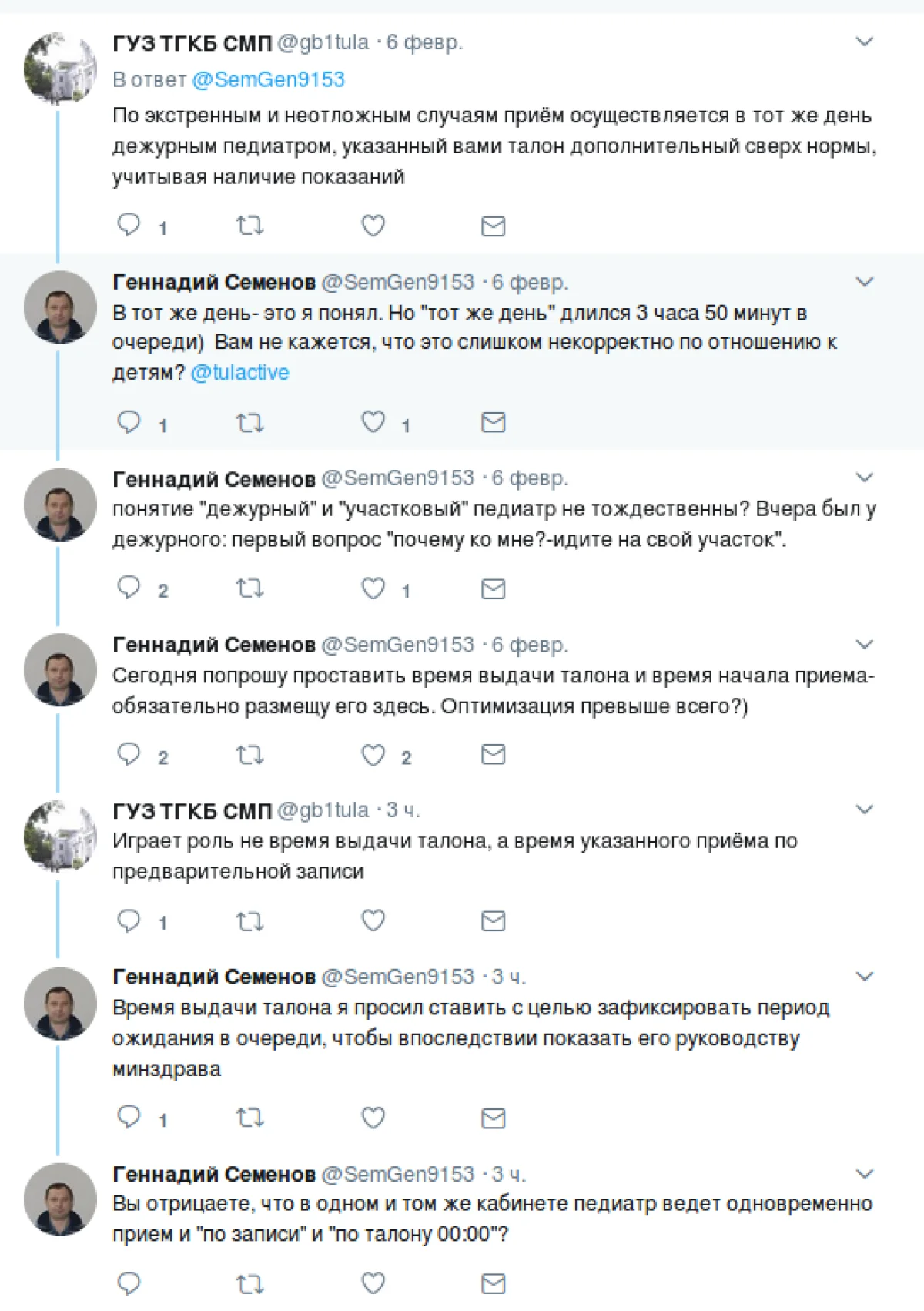 «Что значит на талоне в детской поликлинике время 00:00? Есть ли нормативные требования в части максимального периода ожидания у кабинета врача? В прошлый раз период ожидания был 3 часа 50 минут. За это время ребенок попросту уснул в коридоре на лавке. Предлагаю руководству совместно со мной посидеть в очереди», - написал туляк Геннадий Семенов в своём твиттере, - Такая проблема во всех медучреждениях или этот вопрос назрел не только у меня?
