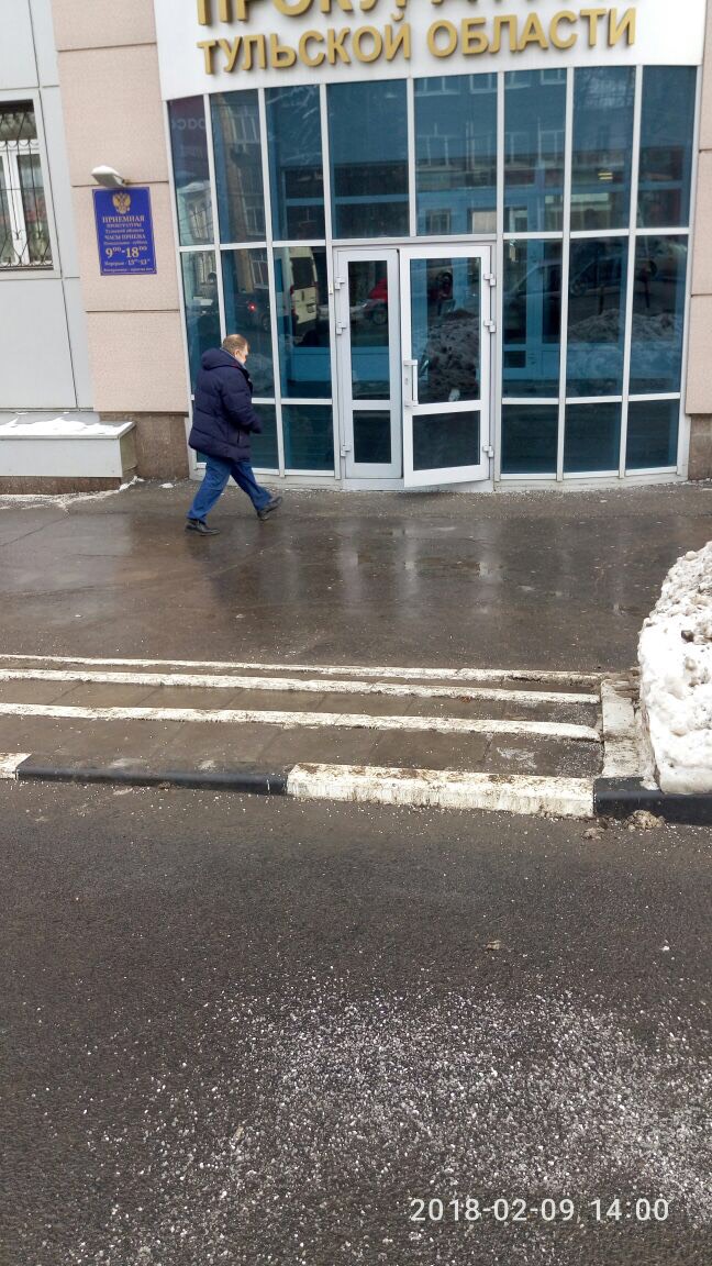 Пользователь Алексей Риттер выложил на YouTube видео, снятое перед зданием Тульской прокуратуры на проспекте Ленина. Как видно на кадрах видеоролика, тротуар сплошь покрыт толстым слоем льда.