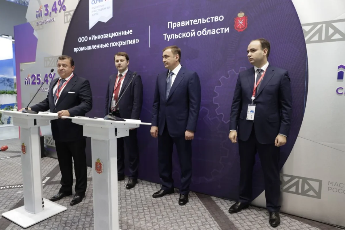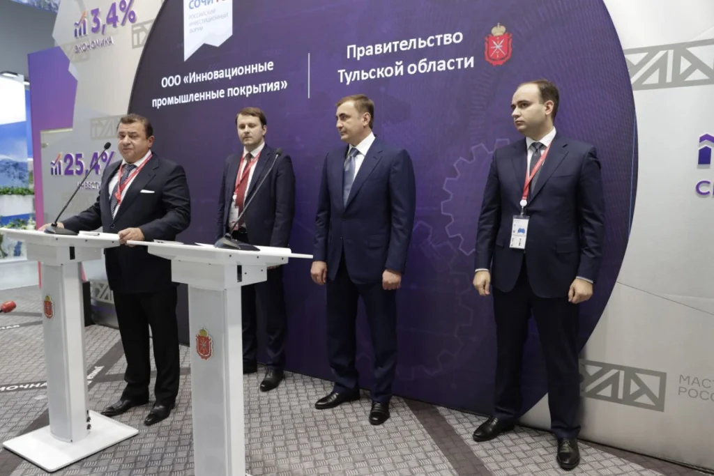 15 февраля на инвестиционном форуме в Сочи заместитель губернатора Тульской области Вячеслав Федорищев подписал соглашение о сотрудничестве с председателем Совета директоров ООО «Инновационные промышленные покрытия» Павлом Грязевым.
