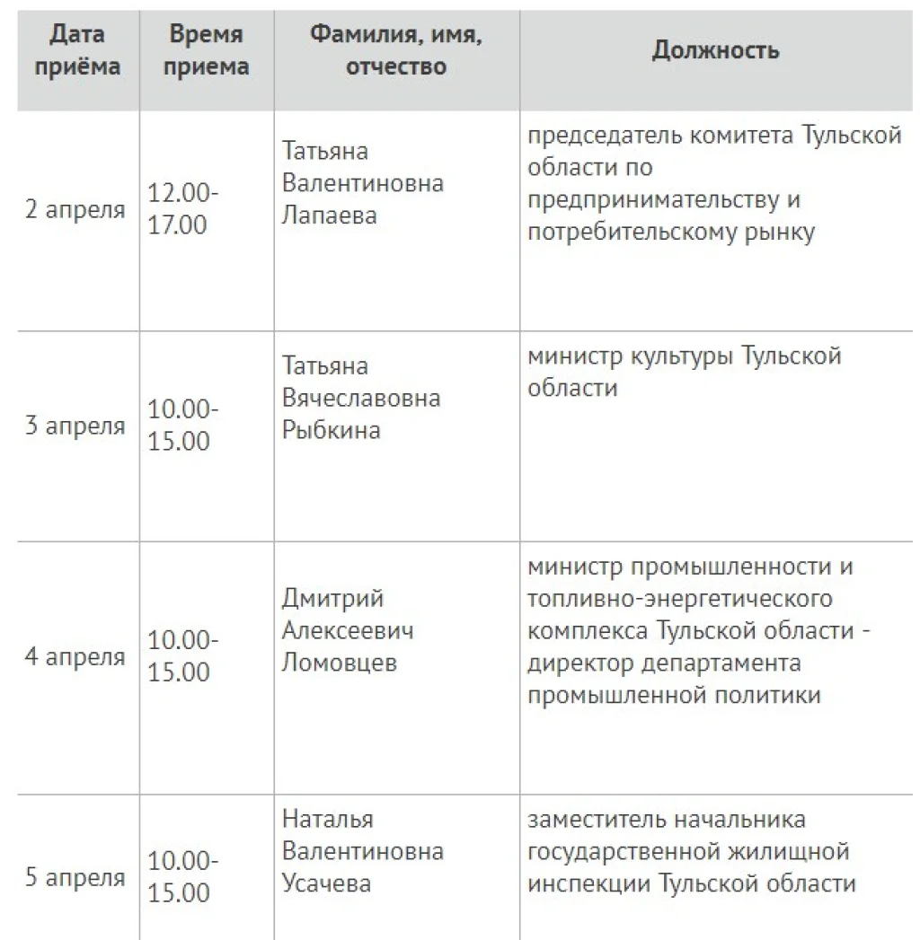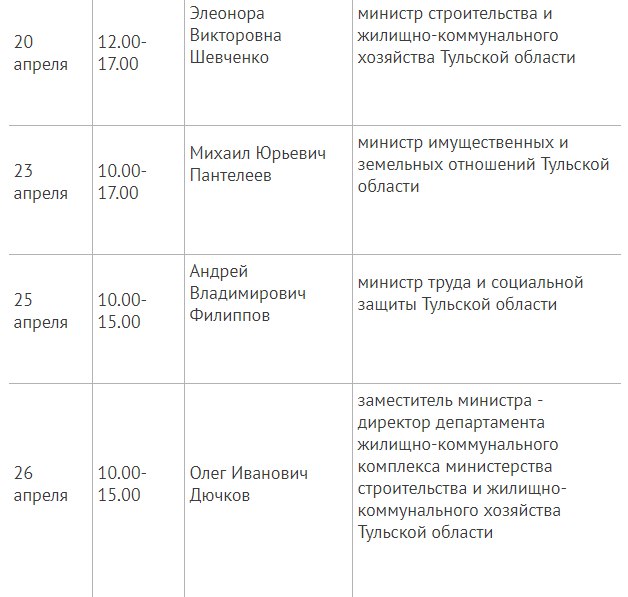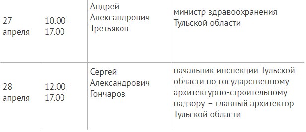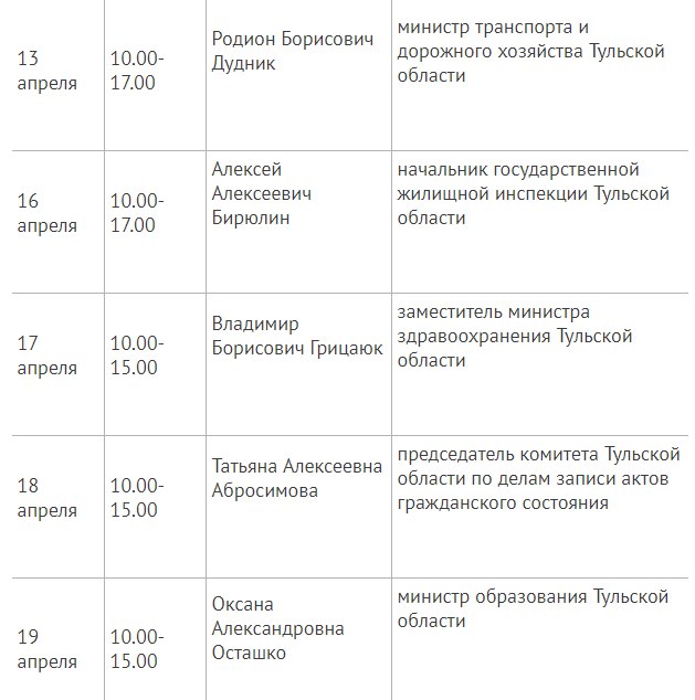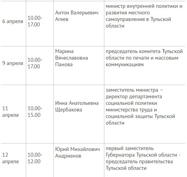 График дежурств на апрель: туляки смогут задать вопросы чиновникам