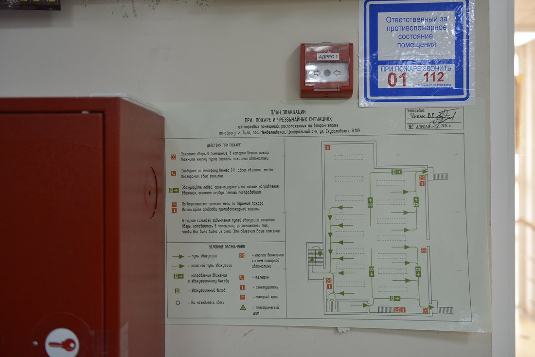 Осматриваемся внутри. Нас встречает план эвакуации, пожарный шкаф, в нем есть огнетушители.