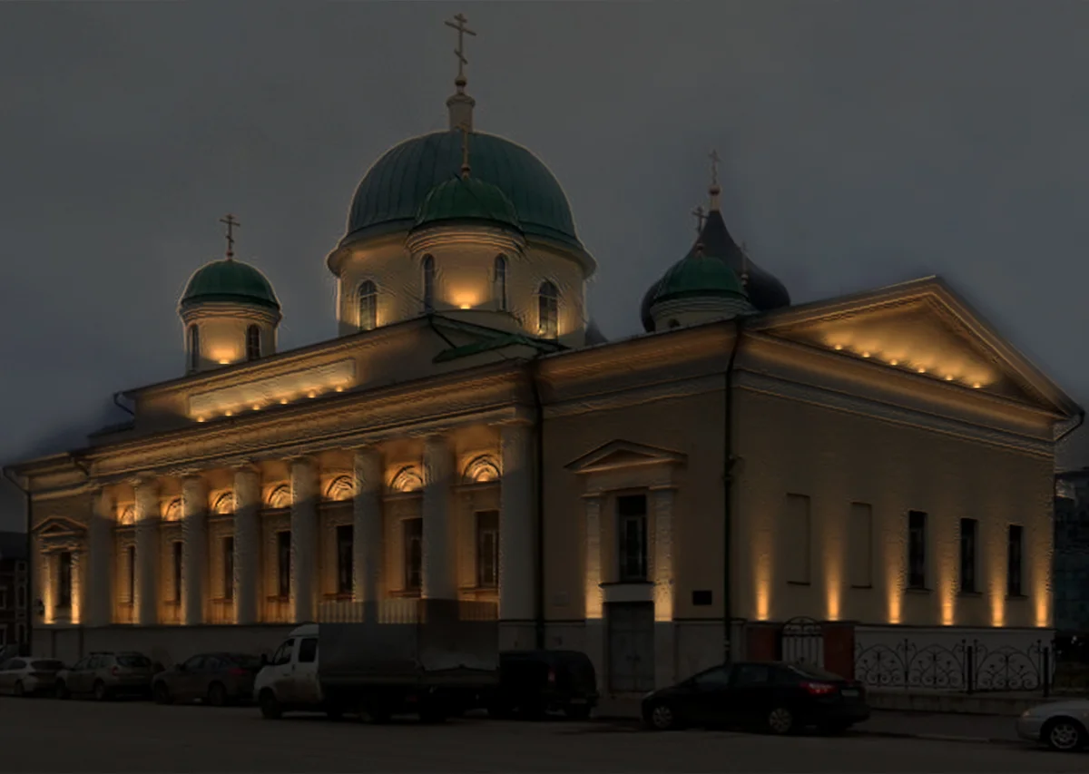 Архитектурную подсветку смонтировали ещё в конце марта, но чтобы включить - ждали Пасху. В праздничные дни Преображенский храм выглядел особенно торжественно. Подсветка выполнена из 96-и светодиодных прожекторов.