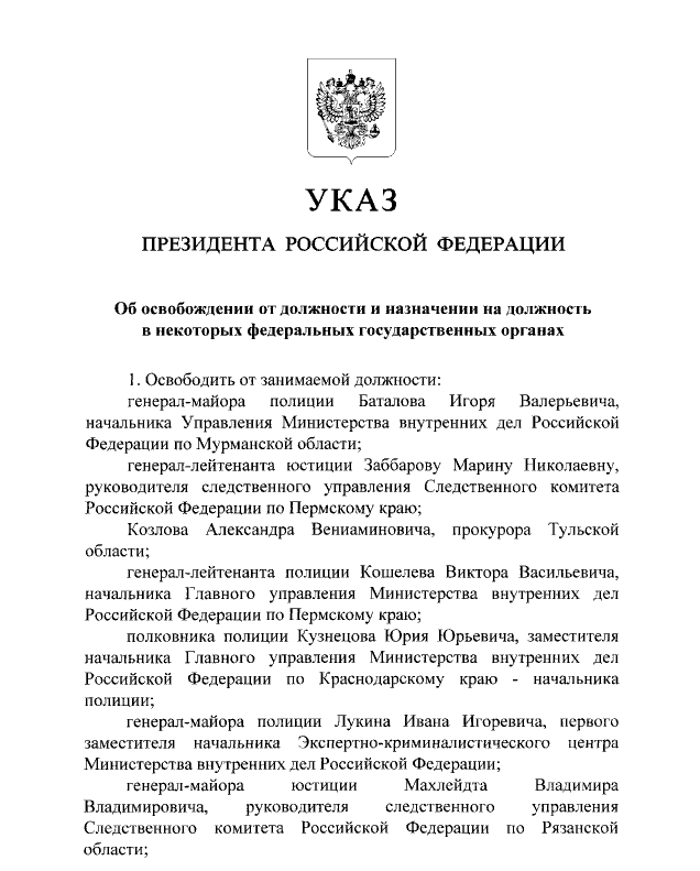 Кроме Козлова с должностей сняли несколько высокопоставленных сотрудников МВД, СК и прокуратуры. Также Указом Президент назначил на должности 16 человек.
