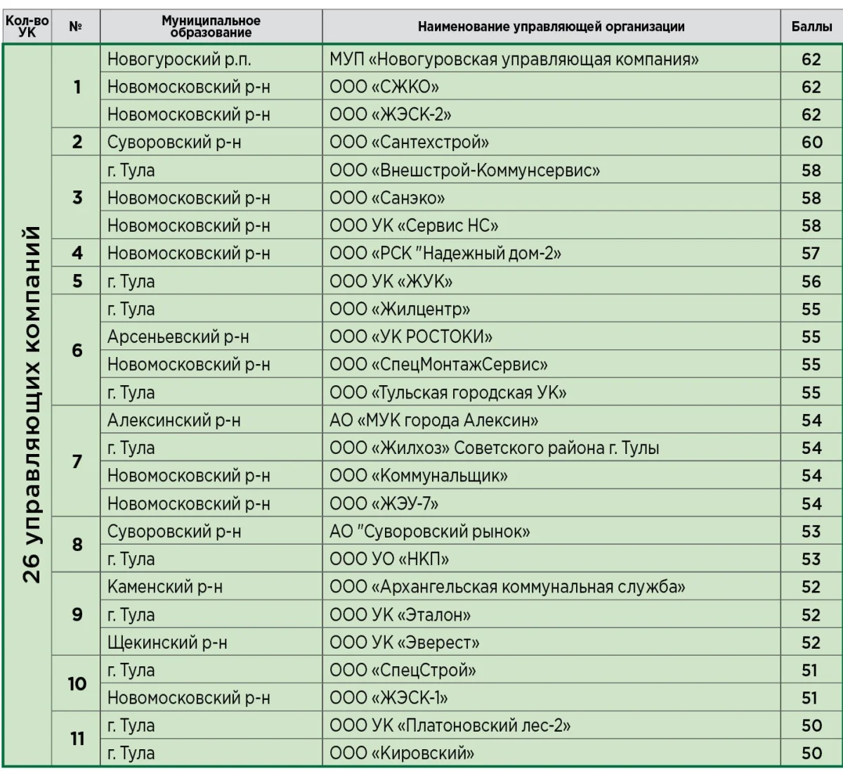 26 управляющих компаний Тульского региона вошли в "зеленую" зону рейтинга УК, опубликованного 7 мая 2018 года.