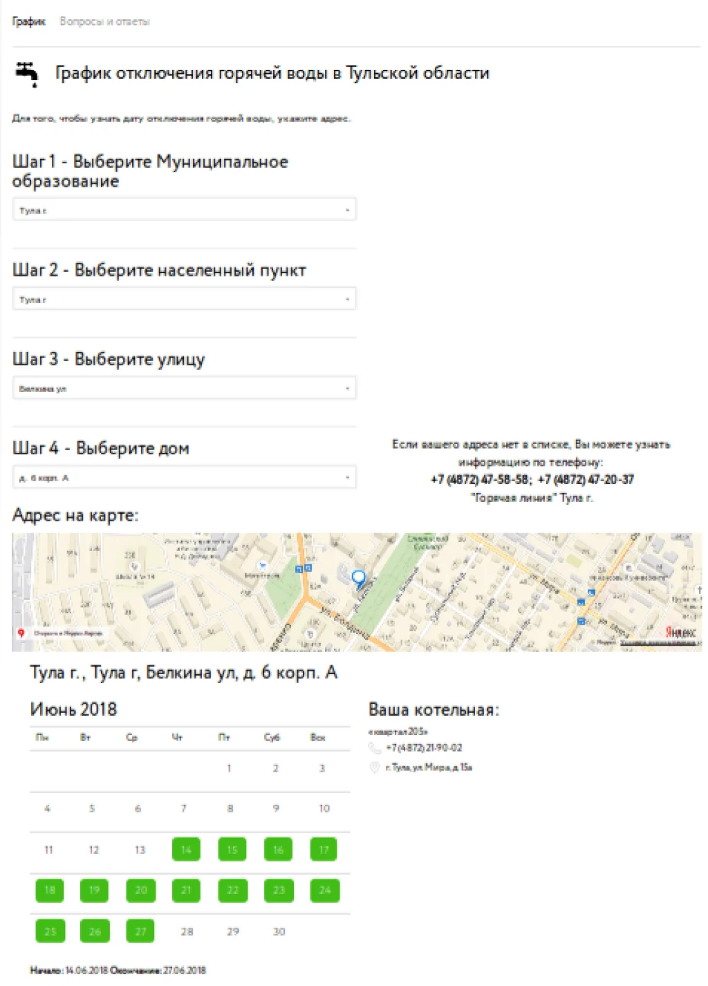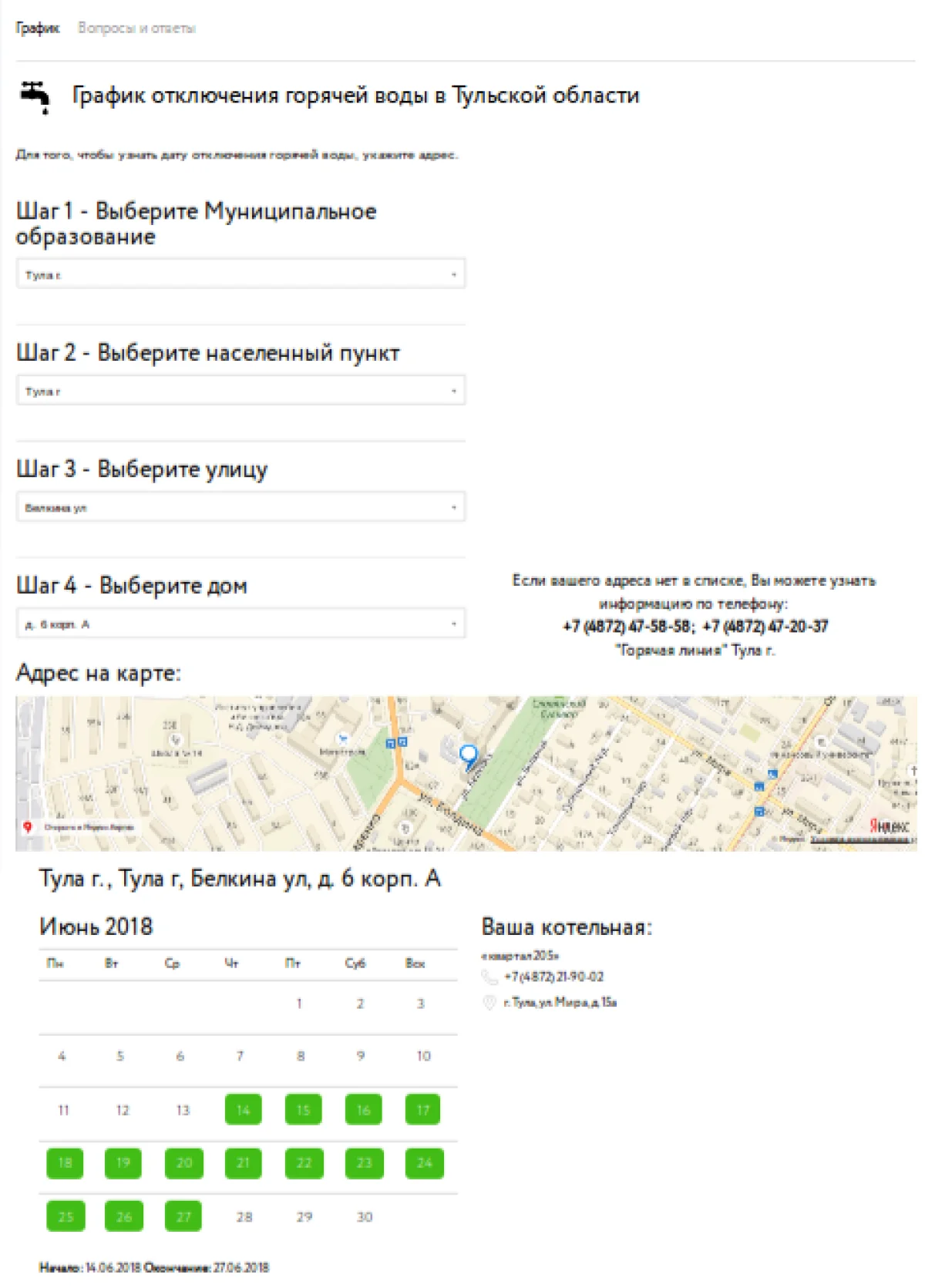 Данный раздел существовал и раньше, однако информация была доступна только по конкретным котельным. Теперь же достаточно ввести свой домашний адрес или адрес нужной организации. В ответ программа выдаст календарь с точными датами - в какие дни в конкретном доме не будет горячей воды.