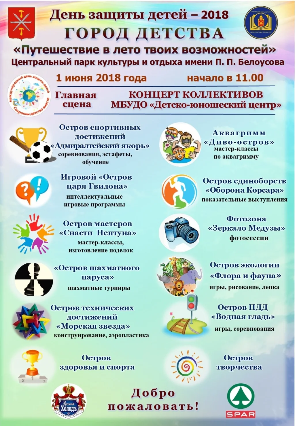 Дети отправятся в увлекательное путешествие по островам, посоревнуются в интеллектуальных играх на «Острове Царя Гвидона», сразятся в шахматном турнире, посетят мастер-классы по аквагриму и изготовлению поделок, увидят показательные выступления борцов на острове «Оборона Корсара», вспомнят правила дорожного движения на площадке «Водная гладь», продемонстрируют свои таланты на островах «Флора и фауна», «Морская звезда», примут участие в фотосессии на площадке «Зеркало Медузы».