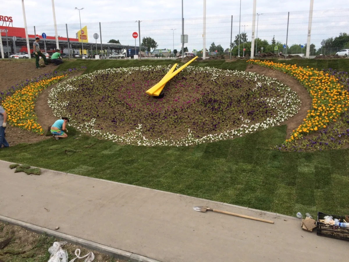 Композицию украсят 6 тысяч однолетников. Сегодня завершится укладка газонного покрытия. Завтра специалисты будут запускать часовой механизм.