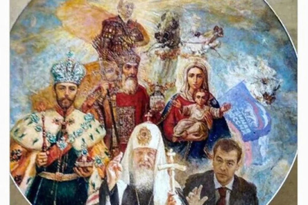 На выставке в тульской детской библиотеке представили картину, на которой президент РФ Владимир Путин и премьер-министр Дмитрий Медведев представлены в виде святых. Полотно носит название «Под мирным небом». Центральное место на холсте занимает Путин в золотых доспехах и в колеснице, запряжённой тремя лошадьми. Компанию ему составили Медведев, Богородица с младенцем, царь Николай II, патриарх Кирилл и флаг «Единой России».