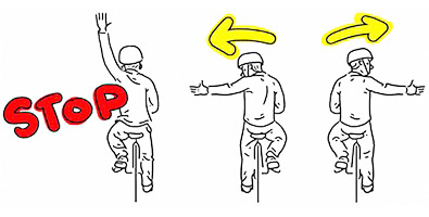 2. При езде по дорогам все свои манёвры необходимо обозначать. Перед началом движения, перестроением, поворотом (разворотом) и остановкой велосипедист обязан предупреждать других участников движения. Во всем мире действует стандартная система велосипедных сигналов: вытянутая рука направо — это поворот направо, аналогично с левой рукой. А, прежде чем остановиться, нужно любую руку поднять вверх.