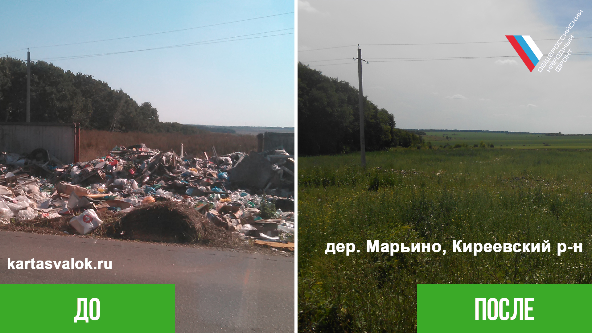 Также общественникам удалось добиться ликвидации крупного полигона, расположенного возле деревни Марьино Киреевского района. С площади около одного гектара было вывезено почти 15 тысяч кубометров мусора.