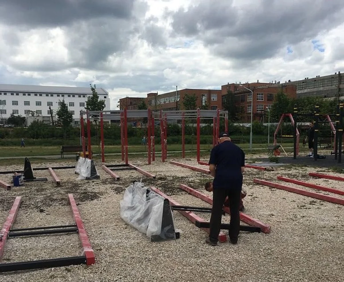 И вот сегодня, 10 июля, был дан старт работам. Во всю идёт разгрузка и монтаж элементов площадки. Силовой комплекс будет включать в себя штанги, гири, груши и многое другое.