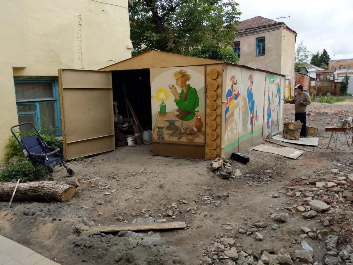 Стены гаража расписаны на улице Металлистов расписаны сюжетами по мотивам повести "Левша", известной каждому ребенку нашей страны и особенно любимой туляками.