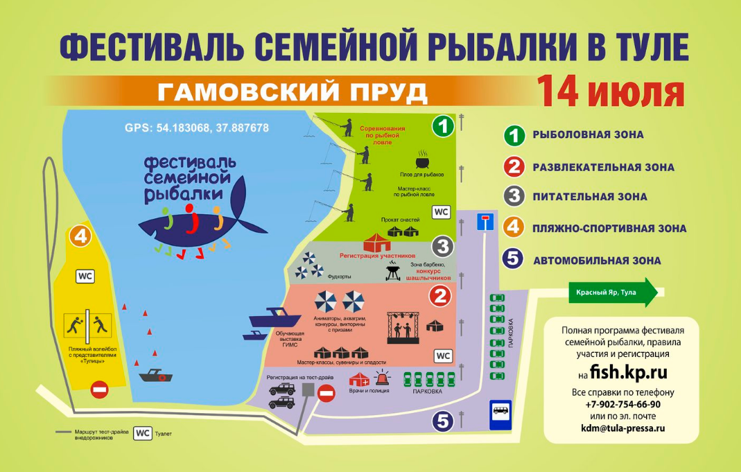 Даже если вы ничего не знаете о рыбалке — приезжайте к нам! Кроме соревнований по рыбной ловле, вас ждут турнир по пляжному волейболу с участием спортсменок «Тулицы», конкурс шашлычников, концерт, фудкорты, аниматоры, аквагрим, мастер-классы для всех, призы, подарки, розыгрыши, тест-драйв по бездорожью, вкусные угощения и многое другое.