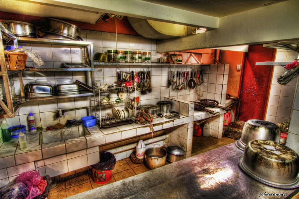 - производственные столы, стеллажи, стены в помещении кухни загрязнены;
