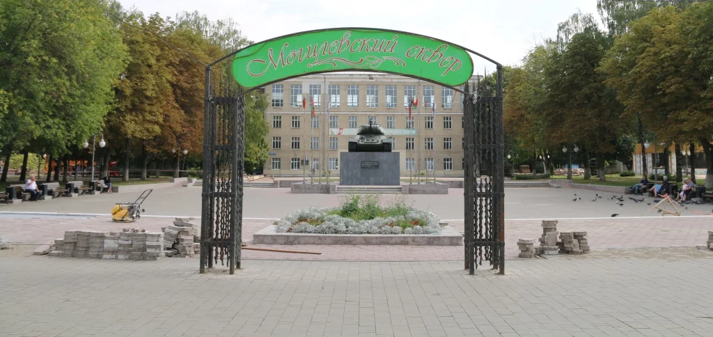 Специалисты удалили 14 повреждённых деревьев, установили новые лавочки и урны, выполнили облицовку ступеней гранитом, частично отремонтировали старое плиточное покрытие, отремонтировали постамент танка.