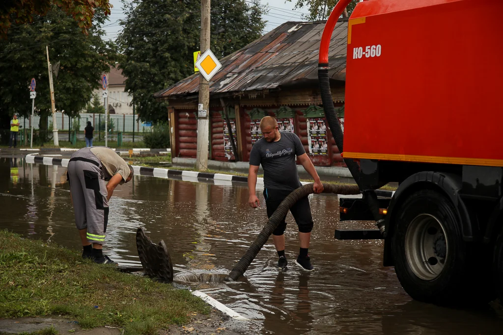 Начальник управления транспорта и дорожного хозяйства Алексей Крыгин и руководители территориальных округов проверяют состояние улиц после прошедшего ливня. Принимаются активные меры по ликвидации потопов