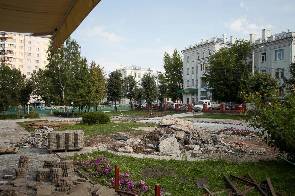 Сейчас на участке демонтируют старое плиточное покрытие и ведут работы по устройству основания фонтана. Также в сквере появятся детские игровые площадки, клумба, будут установлены скамейки и фонари.