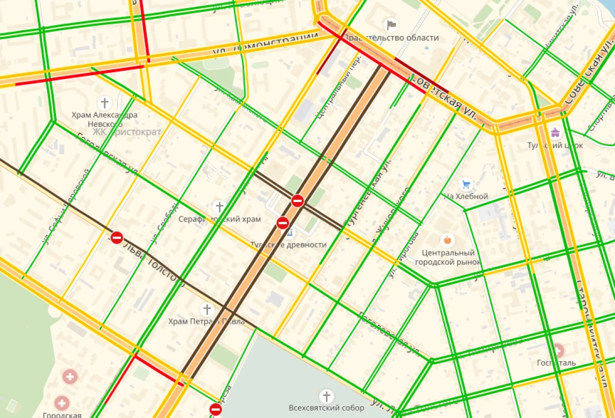 В целях обеспечения безопасности дорожного движения с раннего утра перекрыта ул. Менделеевска. Именно там начинается очередь. Также, судя по Яндекс.Картам, перекрыт проспект Ленина от ул. Первомайской до центральной площади. На отдельных участках наблюдаются значительные заторы. На параллельных улицах также пробки.